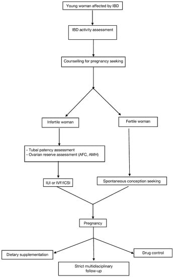 Management flowchart for young women affected by Inflammatory Bowel Disease at reproductive age (IBD: Inflammatory Bowel Disease; AFC: Antral follicular count; AMH: Anti-Mullerian Hormone; IUI: Intrauterine Insemination; IVF: In Vitro Fertilization; ICSI: Intracytoplasmic Sperm Injection).