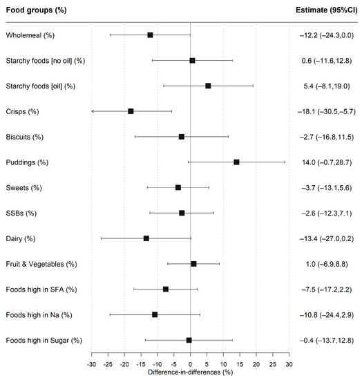 The proportion of children consuming a food group was analysed in the first stage of the two-part model (Figure 1 and Table S3). The foods that were most frequently consumed at lunchtime before the policy included white starchy foods (75.4% vs. 71.3% for intervention and control groups, respectively), fruit and vegetables (95.0% vs. 91.1%) and foods high in salt (69.8% vs. 70.9%), fat (87.9% vs. 86.5%), and sugar (66.2% vs. 71.3%). After the policy had been implemented, there was a decrease in the proportion of the intervention group who ate wholemeal products (−13.9%; 95% CI −21.6, −6.3) and crisps (−11.0%; −18.3, −3.7) but an increase in consuming puddings (16.0%; 5.9, 26.2), with no evidence of a significant change for any food group in the control group. The DID model estimated the policy impact; the estimates remained consistent when accounting for sociodemographic covariates and total lunchtime intake (Table S3). The fully-adjusted results (see Figure 1) showed that the intervention group was less likely to consume crisps after implementation of UIFSM (−18.1%; −30.5, −5.7), with weak evidence of reduction in consumption of wholemeal (−12.2%; −24.3, −0.1; p = 0.05) and dairy products (−13.4%; −27.0, 0.2, p = 0.05). There was also some evidence that the intervention group was more likely to consume puddings after UIFSM (14.0%; −0.7, 28.7; p = 0.06).