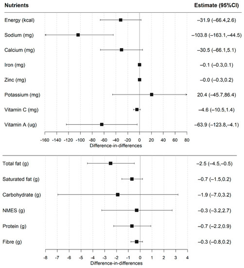The post-UIFSM sodium intakes were significantly lower in the intervention group compared to the control (Figure 3 and Table S6). Estimates of UIFSM impacts on lunchtime nutrient intake were consistent after adjusting for sociodemographic covariates and total lunchtime intake. The fully-adjusted DID model showed that UIFSM resulted in lower total fat (−2.5 g; −4.5, −0.5), sodium (−103.8 mg; −163.1, −44.5) and vitamin A (−63 ug; −123.8, −4.1) intakes. There was weak evidence that UIFSM impacted energy (−31.9 kcal; −66.4, 2.6; p = 0.07) and calcium intakes (−30.5 mg; −66.1, 5.1; p = 0.09). A comparable effect was also observed when total fat was analysed relative to energy intake, which accounts for differences in total energy intake between person (Table S6).