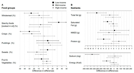 Lunchtime intakes of food groups and nutrients were broadly similar in high-, middle- and low-income intervention groups before implementation of UIFSM (Tables S12 and S13). Except for wholemeal and vegetable products, which were less frequently consumed in the low- compared to the high-income intervention group. Following implementation of UIFSM, there was a significant reduction in the likelihood of consuming crisps (−32.8%; −54.9, −10.6), wholemeal products (−25.7%; −40.5, −10.8) and foods high in saturated fat (−26.5%; −42.6, −10.5) (Figure 4A) in the low-income but not in the middle- or high-income groups. UIFSM was also associated with a significant increase in the proportion of the low-income group eating starchy foods cooked in oil (31.7%; 9.6, 53.8), milk (18.3%; 3.7, 33.0) and water (22.1%; −1.3, 45.5), but not in the middle- or high-income groups. For the middle-income children, there was weak evidence of an increased consumption of puddings (25.1%; 0.3, 49.8).