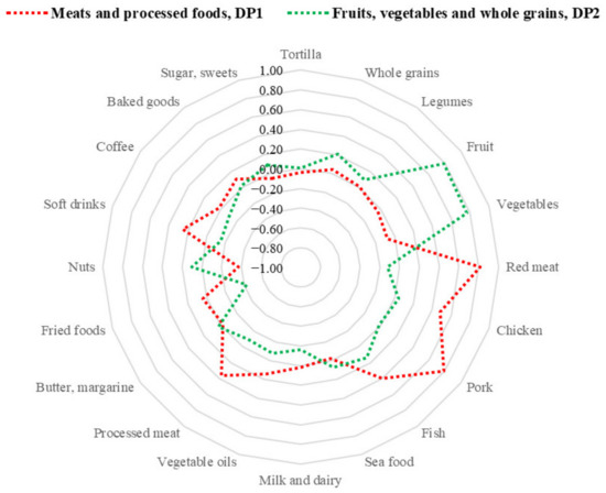 In Mexican women, the first dietary pattern was named “meats and processed foods, DP1” due to the high consumption of red meat, pork, chicken, fish, processed meat, and soft drinks. The second dietary pattern was named “fruits, vegetables, and whole grains, DP2” because it was mainly represented by such food groups (Figure 2). These dietary patterns explained 12.6% and 10.2% of the total variance, respectively.