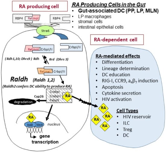 - Iwata, M. Retinoic acid production by intestinal dendritic cells and its role in T-cell trafficking. Semin. Immunol. 2009, 21, 8–13. [Google Scholar] [CrossRef] [PubMed]