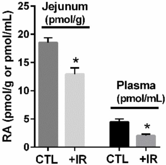 GI mucosal damage results in loss of small intestine RA, which is reflected in reduced plasma RA levels. Loss of gut RA (jejunum, left) resulted in reduced plasma RA levels (right) in a partial body irradiation (PBI) with 5% bone marrow sparing (BM5) non-human primate (NHP) model of radiation-induced gut damage (rhesus macaques; 11.5 Gy PBI/BM5, n = 10; control, n = 10) as quantified by liquid chromatography-tandem mass spectrometry (LC-MS/MS); mean ± SEM (* p < 0.05). Adapted from Yu J, Huang W et al., 2021 [].