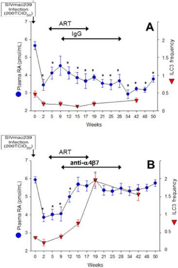 Effects of acute SIV infection and anti-α4β7 antibody treatment on RA production and ILC3 frequency in NHP. NHP (Rhesus macaques) were infected with SIV at week 0 and treated with daily anti-retroviral therapy (ART) and control IgG (n = 7) (A) or ART and anti-α4β7 antibody (n = 8) (B) over the post-infection treatment periods indicated by the black arrows. (A) The ART/IgG regimen showed a rapid decrease in RA levels (blue) along with a decrease in the mean frequencies of ILC3 cells (red). (B) The ART/anti-α4β7 antibody regimen resulted in a recovery of plasma RA levels by week 15 (blue) equivalent to the pre-infection values that was accompanied by an expansion of the ILC3 cells (red). The ILC3 were obtained from the gated population of CD3−/CD8+/HLA-DR+/NKG2a−/NKp44+ cells in samples of colorectal tissue-isolated mononuclear cells from 3 representative animals from each group. RA levels (mean ± SEM) were quantified by LC-MS/MS and compared with pre-infection (week 0) values (* p < 0.05). Adapted from Byrareddy SN et al., 2016 [].