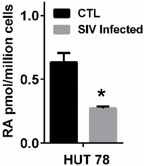 Effects of SIV Infection on RA production in CD4+ T cells. Hut78 cells (CD4+ T cells) or chronically SIV-infected Hut78 cells [] were treated with 2 µM retinol (substrate for RA synthesis) under serum free conditions for 4 h []. RA levels in cell pellets were quantified by LC-MS/MS []. SIV infection reduced the ability of Hut78 cells to make RA. * p < 0.05.