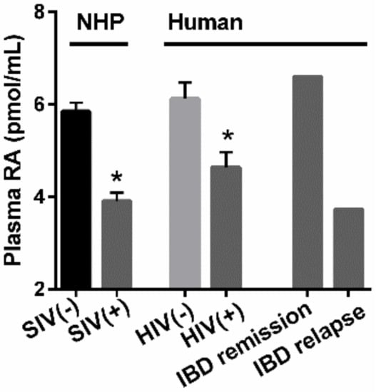 SIV-infected NHP and HIV-infected humans have similar decreases in plasma RA levels, which correlate with decreases in plasma RA levels observed in IBD relapse as compared to IBD remission. NHP (SIV+/−) and human (HIV+/−) plasma RA levels were quantified via LC-MS/MS, mean ± SEM. SIV (−), n = 10; SIV (+) 50 weeks, n = 5; HIV (−), n = 6; HIV (+) for ≥52 weeks, n = 6. IBD remission and IBD relapse levels were median plasma RA levels observed in n = 38 and n = 24 patients, respectively from a study by Paul et al. 2018 [] (* p < 0.05). Adapted from Byrareddy SN et al., 2016 [].
