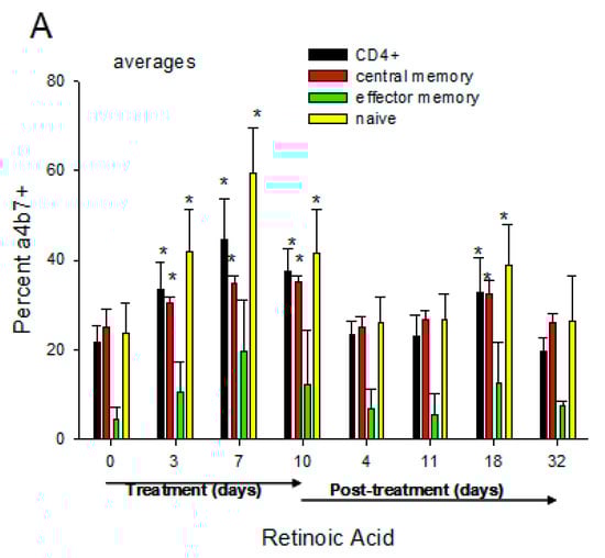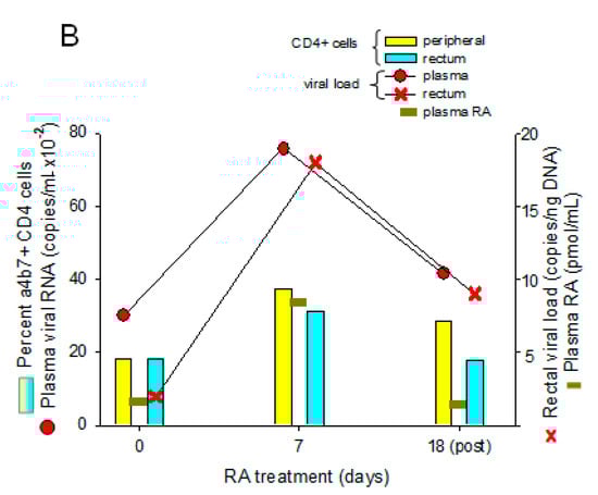 In vivo administration of RA to macaques with low viral loads. Monkeys were fed 10 mg/kg/day all-trans RA (orally) for 10 days, then followed for another 32 days. (A) Increased α4β7 expression on CD4+ lymphocytes. Central memory, effector memory, and naïve CD4+ lymphocytes were gated based on their dual expression of CD28 and CD95 [] and quantified for percent α4β7+ cells. Naïve CD4+ T cells were categorized as CD28+/CD95−, central memory CD4+ T cells as CD28+/CD95+, and effector memory CD4+ T cells as CD28−/CD95+. Results represent the mean ± SEM of 4 monkeys. * p < 0.05, significant difference compared with baseline (day 0) values. (B) Representative example of a “spontaneous controller” monkey from “A” showing the correlation of plasma and rectal viral load with RA levels and expression of α4β7. Adapted from Olwenyi OA, 2020 [].