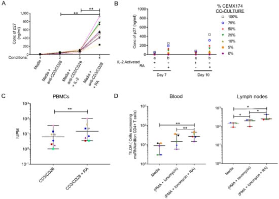 Retinoic Acid (RA) enhances viral replication in vitro and improves detection of the viral reservoir. (A) Levels of p27, a regulatory protein produced by HIV/SIV-infected cells [], were measured in supernatant of peripheral blood mononuclear cells (PBMCs) from 10 randomly selected naive rhesus macaques (RMs). The PBMCs were infected with SIVmac239 after in vitro culturing with (1) media, unstimulated (2) anti-CD3/CD28 beads to activate the T-cell receptor (3) anti-CD3/CD28 + IL-2 (10 U/mL) and (4) anti-CD3/CD28 beads + IL-2 together with RA (1 μM) added under separate conditions on day 10. (B) Levels of p27 detected in supernatant fluids from pooled (n = 10 RMs) enriched CD4 T cells that were treated with either (a) anti-CD3/CD28 and IL-2 only or (b) anti-CD3/CD28 + IL-2 and RA. Thereafter, viral expansion was carried out by the co-culture with CEMX174 cells across different concentrations (0 to 100%) on days 7 and 10 respectively. (C) Quantitative Viral Outgrowth Assay (QVOA) of CD4+ T cells purified from PBMCs of anti-retroviral therapy (ART)-suppressed macaques indicating levels of Infectious Units per Million (IUPM) in CD3/CD28 versus CD3/CD28 + RA conditions (n = 8). (D) levels of msRNA transcripts obtained from enriched CD4 T cells collected from PBMC (n = 5 RMs) or auxiliary lymph node CD4+ T cells (n = 4 RMs) that were cultured in media only, media plus phorbol myristate acetate (PMA) + ionomycin and media plus PMA + ionomycin supplemented with retinoic acid. * shows p < 0.05 and ** represents p < 0.001 significant difference across studied groups obtained using Wilcoxon matched pairs signed rank tests. Reproduced with permission from Figure 1 from Olwenyi OA et al. [].