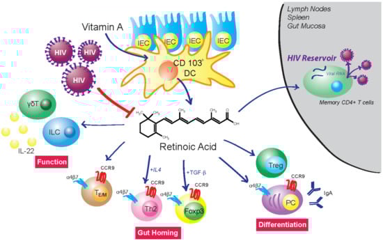 HIV infection disrupts RA-mediated control of intestinal homeostasis. Mucosal CD103+ dendritic cells (DC) express Raldh2 and are a major source of RA production in the gut. They are among the first cells encountered by HIV and their infection inhibits RA biosynthesis. Studies have shown that acute HIV/SIV infection is closely linked to disruption of cell populations whose identity and function are regulated by RA. RA controls the differentiation of T cells into Tregs and B cells into IgA-producing plasma cells (PC). It also regulates the migration of lymphoid cells into the intestine by induction of gut-homing receptors α4β7 and CCR9. RA enhances IL-22 production from γδT cells and innate lymphoid cells (ILC). IL-22 plays a vital role in the regulation of multiple aspects of gut epithelial integrity, including control of epithelial cell growth and permeability, production of mucus and antimicrobial proteins, and complement production. RA supplementation can enhance activation of replication-competent HIV reservoirs. These data suggest the possible therapeutic use of retinoid derivatives to counteract HIV-associated enteropathy and as part of a “shock and kill” strategy to deplete latent viral infection.