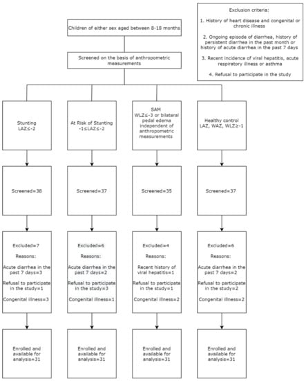 This study was a cross-sectional study conducted in a cross-sectional manner in the slum areas and adjacent localities of Bauniabadh, Mirpur, Dhaka and in the Dhaka Hospital of icddr,b between October 2018 to February 2019. The study participants enrolled from the community were aged between 8 and 18 months of either sex recruited into two malnourished cohorts comprising of: stunted (LAZ < −2) and children at risk of stunting (LAZ < −1 to −2). Healthy children (LAZ, WAZ, WLZ > −1 and having no bilateral pedal edema) of identical age groups were recruited from the same demographic area in the community and served as the controls. Age and sex matched children with SAM (WLZ < −3 or presence of bilateral pedal edema independent of anthropometric measurements) were enrolled exclusively from the Dhaka Hospital of icddr,b, following acute phase management and prior to the start of nutritional rehabilitation.