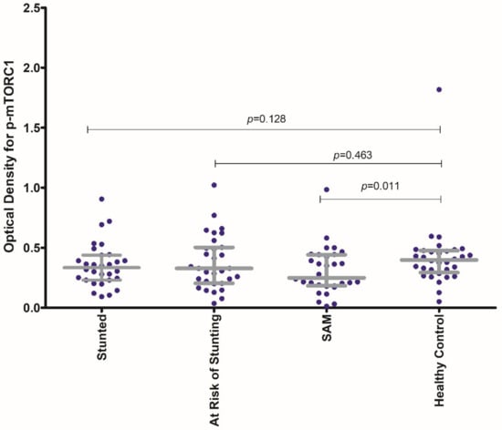 Comparison of the activity of phospho-mTORC1 (as expressed by the OD for phospho-mTORC1 at 450 nm) for each of the malnourished study arms (stunted, at risk of stunting and SAM) with that of the healthy control group. The p-value shown is the result of the Mann–Whitney U test comparing the median OD value for p-MTORC1 of each of the malnourished groups (stunted, at risk of stunting, SAM) with that of the healthy control group. The colored dots represent the individual OD values for p-mTORC1 at 450 nm.