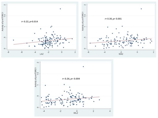 The OD values for p-mTORC1 at 450 nm for the SAM group were found to be significantly lowered in comparison to that from the healthy control group. No statistically significant difference in OD values for p-mTORC1 at 450 nm for the stunted and for the “at risk of stunting” group was observed in comparison to the healthy control group. Moreover, the activity of p-mTORC1 (as denoted by OD values at 450 nm) was found to have significant statistical correlations with all the anthropometric indices (LAZ, WAZ and WLZ) as shown in Figure 3. The strength of correlation of the activity of p-mTORC1 was the highest with WAZ and the lowest with LAZ.