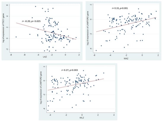 Consequently, correlation analyses revealed a significant positive correlation between the expression of the LAMTOR2 gene with the anthropometric measurements of LAZ, WAZ and WLZ. A significant negative correlation was observed between the expression of the TSC1 gene and the anthropometric measurement of LAZ. Figure 4 illustrates the aforementioned significant correlations between the gene expressions and the anthropometric indices. All the results from the correlation analysis between the selected mTOR pathway genes and different anthropometric measurements (LAZ, WAZ, and WLZ) have been summarized in Table S3.