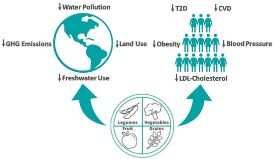 A possible line of action, that is receiving ever-increasing interest, is to transition towards a plant-based food system. Plant-based foods have a significantly smaller footprint on the environment than animal-based foods. Even the least sustainable vegetables and cereals cause less environmental harm than the lowest impact meat and dairy products []. On top of the low environmental impact of plant-based diets (PBDs), they may provide additional benefits to human health. Unhealthy diets now represent the largest burden of disease globally, presenting a greater risk to morbidity, disability, and mortality than unsafe sex, alcohol, drug, and tobacco use combined []. Adopting plant-based food systems may allow countries to reduce their environmental footprints and tackle their obesity and diet-related non-communicable disease burdens simultaneously. A few reviews have covered the planetary and human health benefits associated with PBDs; however, since their publication, additional data of relevance have become available [,,]. The aim of this review is to provide a concise summary of the planetary and human health benefits associated with PBDs using evidence from the latest advances in the field. This review will also summarise the main barriers to PBDs and offer potential solutions.