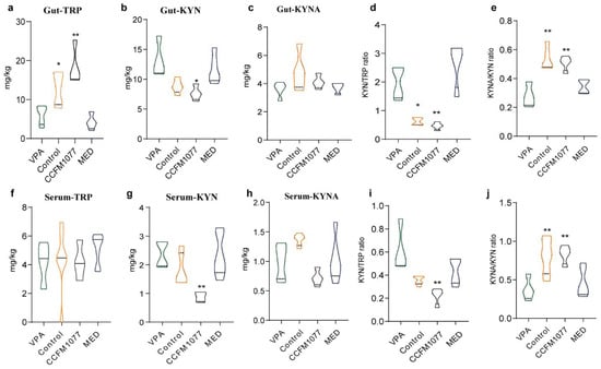 B. longum CCFM1077 did not considerably regulate the α diversity (Figure 3a–d). On the basis of the Bray–Curtis distance, the differences among four groups were analysed through CPCOA (Figure 3e). The maximum total variation for the VPA, CCFM1077, and MED groups was 18.7%, and a significant difference was observed (p < 0.033). The heat map of the genus level based on the cluster analysis between groups showed that the distribution of the genus level in the group treated with B. longum CCFM1077 was similar to that of the healthy rat group (Figure 3f). Moreover, B. longum CCFM1077 did not considerably regulate the level of Bacteroidetes (p = 0.3477, Figure 3g) and Firmicutes (p = 0.2157, Figure 3h) in autistic-like rats. On the gene level (Figure 3i), B. longum CCFM1077 significantly increased the abundance of the Ruminococcaceae NK4A214 group (p = 0.0082) and Lachnoclostridium (p = 0.019), and significantly decreased the abundance of Ruminococcus UCG-010 (p = 0.031), Intestinimonas (p = 0.044), Rodentibacter (p = 0.035), and Marvinbryantia (p = 0.019). At the Bifidobacterium level (Figure 3j), B. longum CCFM1077 significantly decreased the B. ruminantium abundance (p = 0.038). Moreover, B. longum CCFM1077 influenced the abundance of B. Pseudomonas subsp. Globosum, B. animalis (B. animalis subsp. animalis), and B. longum (B. longum subsp. infantis and B. longum subsp. longum) (Figure S1a–f), but this influence was not notable. On the level of Lactobacillus (Figure 3k), B. longum CCFM1077 significantly decreased the abundance of L. johnsonii (p = 0.027), L. reuteri (p = 0.045), and L. taiwanensis (p = 0.045) and regulated the abundance of L. intestinalis, L. mucosae, L. murinus, and L. acidophilus (Figure S1h–k). The abundance of the Ruminococcaceae NK4A214 group was strongly correlated with the KYNA and KYNA/KYN levels in the serum. The abundance of Ruminococcaceae UCG-010 was negatively correlated with the KYNA level in the serum, and that of L. johnsonii was positively correlated with the KYN level in the brain. The abundance of L. reuteri was negatively and positively correlated with the KYN and KYNA levels in the serum, respectively. The abundance of L. taiwanensis was negatively correlated with the KYNA/KYN level in the serum, and that of B. pseudocatenulatum was positively correlated with the KYN/TRP and KYN levels in the cecum and brain. The abundance of L. murinus was negatively correlated with the KYN level in the brain. Thus, the regulation of KP metabolism by B. longum CCFM1077 was closely related to the corresponding enhancement in the gut microbiome.