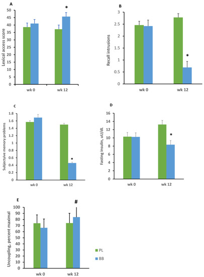 | Factor | Placebo (n = 14) | Blueberry (n = 13) | t-Value | p |