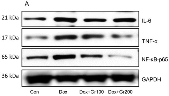 Geraniol’s anti-inflammatory activities have been demonstrated elsewhere. To further confirm the potential anti-inflammatory action of geraniol in the context of Dox treatment, we used Western blots to evaluate the expression of proteins important in inflammatory regulation (NfkB-p65, TNF-α, and IL-6). The results showed that expression changes driven by Dox were restored in the rats treated with geraniol (Figure 4A–D), and indicate that geraniol has anti-inflammatory effects.
