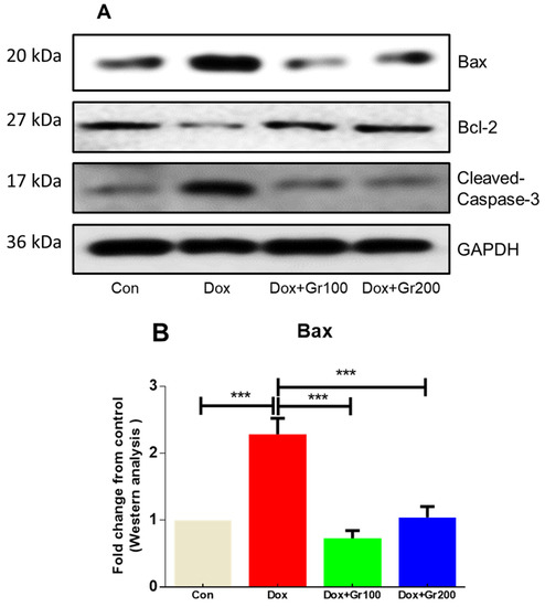 Nuclear factor-κB (NF-κB) is a transcriptional factor that regulates the expression of many inflammatory genes; as the central figure of the NF-kB pathway, which is activated by reactive oxygen species (ROS), it can trigger inflammatory response and resultant tissue injury [8,22,23]. Numerous studies have reported Dox to cause inflammation and increase production of pro-inflammatory cytokines such as interleukin-6 (IL-6), interleukin-1 beta (IL-1β), and tumor necrosis factor alpha (TNF-α) [11,13]. In addition, increased ROS production after Dox-mediated kidney damage has been shown to play a key role in activating the intrinsic apoptotic pathway through mitochondrial instability. Key determinants of this pathway are the mitochondrial-associated proteins Bax and Bcl-2; a balanced ratio of Bcl-2 to Bax prevents apoptosis, while imbalance leads to increased membrane permeability and leakage of cytochrome c into the cytosol, which activates caspase-9 (Casp-9) and caspase-3 (Casp-3). Such activation generally leads to DNA fragmentation and cell death [11,24,25,26,27,28,29].