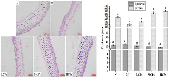 The UV and D-galactose treatment (M group) significantly reduced the moisture, HA, and Hyp content in the skin, compared to those of the N group, by 13.36%, 24.08%, and 15.83%, respectively (p < 0.05) (Table 2). The contents of moisture, HA, and Hyp in the skin were significantly higher in mice after the oral administration of CPs compared to the contents of those in the mice of the M group (p < 0.05). Among the dose groups, the contents of the three skin components were significantly different between the LCP and HCP groups and were dependent on the dose of intake of CPs. The HCP group had even higher contents than the N group, and HA and Hyp were significantly different between the two groups (p < 0.05).