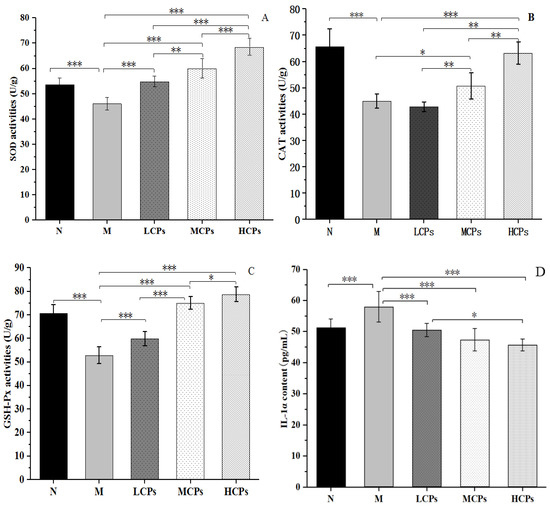 Effect of CPs on SOD (A), CAT (B), GSH-PX (C) activities and IL-1α content (D) in the skin (n = 10). Note: CP superoxide dismutase (SOD), glutathione peroxidase (GSH-PX), and catalase (CAT); *, ** and *** indicated that the data had statistically significant differences (p < 0.05), very significant (p < 0.01) and extremely significant (p < 0.001), respectively.