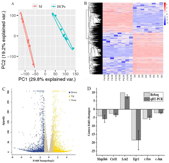 Analysis techniques, such as PCA, HCA, gene GO enrichment, and KEGG pathway enrichment were used to analyze the transcriptome data. Based on the PCA analysis (Figure 4A) and hierarchical clustering analysis (heat map) of 4303 differential genes with average channel strength greater than 100, the relative expression levels of total DEGs between the two treatment groups are shown to provide an overview of the changes in gene expression (Figure 4B). The M group and the HCP group were significantly separated, and the expression patterns of most DEGs in the M and HCP groups were opposite, indicating that there were significant differences between the mouse skin after HCP treatment and the M group (Figure 4A,B). Pairwise comparisons showed that after feeding HCPs, 4303 genes were significantly expressed in the mice skin, including 1790 upregulated genes and 2513 downregulated genes (Foldchange > 2, p < 0.05) (Figure 4C). Among the six genes associated with skin aging quantified by qRT-PCR, five genes (including Fos, Jun, Cxcl1, and Egr1) were downregulated, and one gene was upregulated (Figure 4D), which was consistent with the overall trend of transcriptomic data. The RNA expression levels of Fos, Jun, and Cxcl1 were significantly upregulated in damaged skin compared to that in intact skin [34], and inhibition of Egr1 expression alleviated skin inflammation [35]. These results reflected the reliability of transcriptome sequencing data, and oral CPs effectively alleviated skin aging.