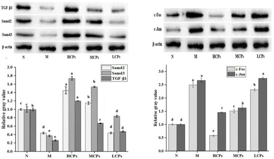 Effects of CPs on the TGF-B/Smad signaling pathway and AP-1 protein. Different letters in the same column indicate significant differences (p < 0.05).