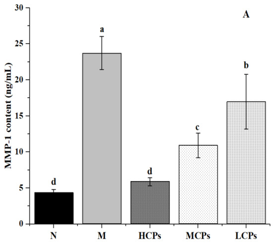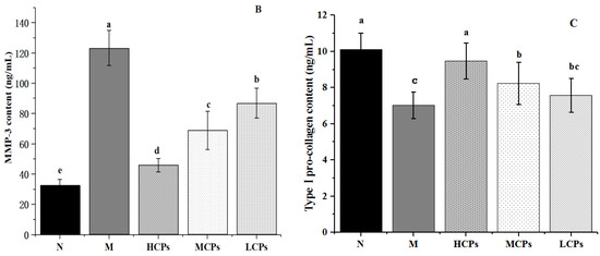 Effects of CPs on MMP-1 (A), MMP-3 (B), and Type I pro-collagen (C). Different letters in the same column indicate significant differences (p < 0.05).