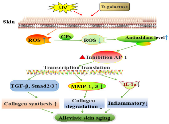 Therefore, this study showed that dietary CPs could alleviate skin aging induced by UV and D-galactose in a dose-dependent manner. CPs alleviate skin aging by lowering skin oxidation level, inhibiting the expression of key transcription factors AP-1 (c-Jun and c-Fos), activating the TGF-β/Smad signaling pathway to promote collagen synthesis, inhibiting the expression of MMP-1 and MMP-3 (that inhibit collagen degradation), and inhibiting skin inflammation to alleviate skin aging (Figure 8). Moreover, our findings in the current study also suggest that the activated lysosome may be an important pathway for CPs to regulate skin aging, which deserves special attention.