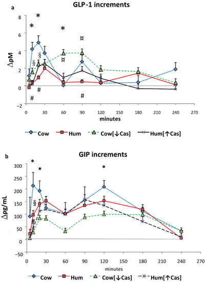GLP-1 and GIP. Abbreviations: GIP: glucose-inhibitory-polypeptide; GLP-1: glucagon-like polypeptide-1; Hum: human; Cow [↓Cas]: low-casein cow milk; Hum [↑Cas]: high-casein human milk. (a): Increments vs. baseline values of plasma GLP-1 concentrations (expressed as Δ pM/mL) following milk administration over the 240 min study period. Data are means ± SEM. The symbols indicate the statistical difference (by two-way ANOVA the Fisher’s LSD test): (*) at 10′, 20′ and at 60′ between Cow [n = 7] and Cow [↓Cas] milk (n = 9) (p = 0.025, p < 0.04, and p < 0.002, respectively); [#] at 10′, 20′ and 90′ between Cow [n = 7], and Hum [n = 7] milk (p = 0.002, p < 0.0015, p = 0.066); [§] at 10′ and 20′ between Cow [n = 7] and Hum [↑Cas] [n = 6] milk (p < 0.002 and p < 0.04, respectively); and finally [¤] between Hum [n = 7] and Cow [↓Cas] milk [n = 9] at 60′ and 90′ (p < 0.005 at both time points) (by two-way ANOVA the Fisher’s LSD test). (b): Increments vs. baseline values of plasma GIP concentrations (expressed as Δ pM/mL) following milk administration over the 240 min study period. Data are means ± SEM. The symbols indicate the levels of statistical difference (by two-way ANOVA the Fisher’s LSD test): (*) at 10′, 20′ and 120′ between Cow [n = 7] and the Cow [↓Cas] milk [n = 9] (p < 0.0001, p = 0.015 and p < 0.02 respectively); at 10′ between the Cow [n = 7] and either [§] the Hum [n = 7] (p < 0.02) or the [#] Hum [↑Cas] [n = 6] (p = 0.001) milk.