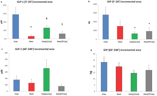 GLP-1 and GIP incremental areas. Abbreviations: GIP: glucose-inhibitory-polypeptide; GLP-1: glucagon-like polypeptide-1; Hum: human; Cow [↓Cas]: low-casein cow milk; Hum [↑Cas]: high-casein human milk. (a): Integrated increments of GLP-1 vs. baseline over the [5′–20′] period. The symbols indicate significant differences between Cow milk [n = 7] and either [*] Hum (n = 7) (p < 0.002), [#] Cow [↓Cas] [n = 9] (p < 0.035) or [§] Hum [↑Cas] milk [n = 6] (p < 0.007) (by one-way ANOVA and the Fisher’s LSD test). (b): Integrated increments of GIP vs. baseline over the [5′–20′] period. The symbol (*) indicates a significant difference between Cow [n = 7] and either the Cow [↓Cas] milk [n = 9] (p < 0.012) or the Hum [↑Cas] milk [n = 6] (p = 0.03) (by one-way ANOVA and the Fisher’s LSD test). (c): Integrated increments of GLP-1 vs. baseline over the [60′–240′] period. There was no significant difference among the four milk types. (d): Integrated increments of GIP vs. baseline over the [60′–240′] period. There was no significant difference among the four milk types.