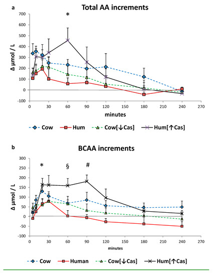 The sum of NEAA increased, although to a variable extent, with all milk types too (p < 0.002 by 2-WAY ANOVA for repeated measurements, interaction effect), again peaking at 20′–30′ with Cow, Hum and Cow [↓Cas] milks, and at 90′ with the Hum [↑Cas] milk. There was no significant difference in the sum of NEAA increments between the groups at any time point.