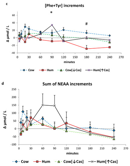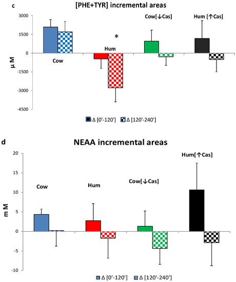 The (Phe+Tyr) iAUC in the [0′–120′] iAUC was not different between the four milk types, whereas in the [120′–240′] interval the iAUC with Hum milk was significantly lower than that with Cow milk (p < 0.003), and nearly significantly lower than that Cow [↓Cas] milk (p = 0.054) (Figure 6c).