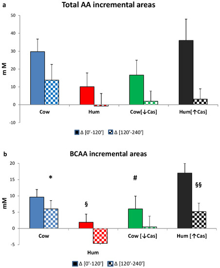 Incremental areas of amino acids. Abbreviations: AA: amino acids; BCAA: branchedchain AA; Phe: phenylalanine; Tyr: tyrosine; Hum: human; Cow [↓Cas]: low-casein cow milk; Hum [↑Cas]: high-casein human milk. (a): Integrated incremental areas under the curve (iAUC) over baseline, of total AA concentrations, in the [0′–120′] (left full bars) and the [120′–240′] iAUC (right checkered bars) time intervals, respectively. There was no difference, among the four milk types, in either the [0′–120′] or the [120′–240′] iAUC. The [120′–240′] areas were lower (p < 0.0001) than the [0′–120′] ones (by the paired t test) in all milk groups. (b): Integrated incremental areas under the curve (iAUC) over baseline, of the BCAA concentrations, in the [0′–120′] (left full bars) and the [120′–240′] iAUC (right checkered bars) time intervals, respectively. The symbol (*) indicates a significant difference (by one-way ANOVA and the Fisher’s LSD test) between Cow and Hum milk (p < 0.03) in the [120′–240′] iAUC. The symbol (§) indicates a significant difference (p < 0.03) between Hum and Hum [↑Cas] in the [0′–120′] iAUC. The symbol (#) indicates a significant difference (p < 0.02) Cow [↓Cas] and Hum [↑Cas] in the [0′–120′] iAUC. The symbol (§§) indicates a significant difference (p < 0.04) between Hum and Hum [↑Cas] milk the [120′–240′] iAUC. The [120′–240′] areas were significantly lower (p < 0.0001) than the [0′–120′] ones (by paired t test). (c): Integrated incremental areas over baseline, of the sum of phenylalanine (Phe) and tyrosine (Tyr) concentrations, in the [0′–120′] (left bars, full colors) and the [120′–240′] (right bars, checkered-pattern colors) time intervals, respectively. The symbol (*) indicates a significant difference between Hum and Cow milk in the [120′–240′] (p < 0.003), as well as borderline-significant difference between the Hum and the Cow [-Cas] milk (p = 0.057). The [120′–240′] areas were significantly lower [p < 0.0001] than the [0′–120′] ones (by paired t test). (d): Integrated incremental areas over baseline, of the sum of non-essential amino acids (NEAA) (alanine, glycine, proline, serine, hydroxyproline, cysteine, glutamate, tyrosine), in the [0′–120′] (left bars, full colors) and the [120′–240′] (right bars, checkered-pattern colors) time intervals, respectively. There were no differences in the iAUC in any study group. The [120′–240′] areas were lower (p = 0.001) than [0′–120′] ones (by the paired t test) in each experimental group except for the Cow milk group.