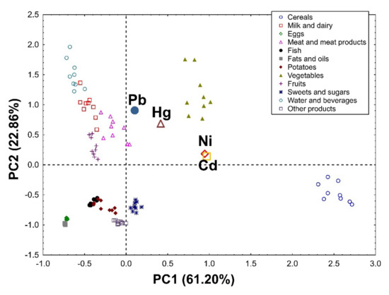 PCA biplot showing loadings (for heavy metals) and scores (for products) of the first two principal components of PCA in the group of women, explaining together 84.06% of the variability in the obtained dataset (61.20% and 22.86% in PC1 and PC2, respectively).