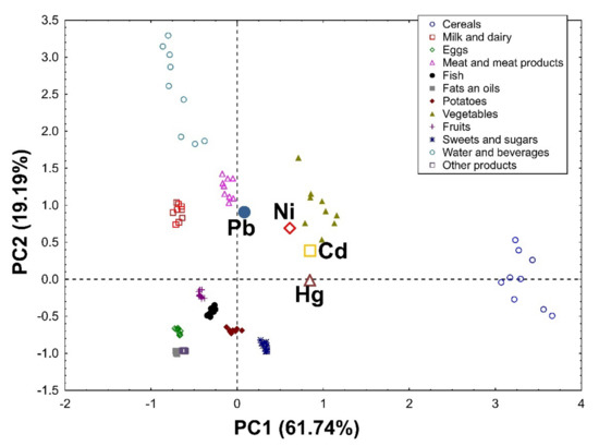 In the group of men, PC1 is also associated with the total supply of heavy metals and, first of all, it distinguishes the first group (cereals and vegetables) as products supplying the largest amounts of heavy metals, and the second group (eggs, fats and oils, and other products) as products providing the smallest amounts of these elements. In addition, it was revealed that cereals contributed the most to the daily intake of Hg and Cd. PC2 definitely distinguishes water and beverages as products that provide the highest amounts of Pb and a lot of Ni. Moreover, large amounts of Pb were delivered with vegetables, meat, and meat products, as well as milk and dairy products (Figure 2). In addition, vegetables, meat, and meat products significantly contributed to the total intake of Ni. It was also confirmed that, despite containing high amounts of Hg, considering their very low consumption, fish were not an important source of this element for the general population in the present study.