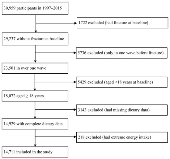 In our study, data from 1997 to 2015 were selected to investigate the association between dairy product intake and the risk of fracture, because dietary data in 1991 and 1993 were not correctly coded and could not be identified. Participants were excluded if they met one of the following conditions: (1) had a fracture at baseline, (2) only in one wave before the occurrence of fracture, (3) aged < 18 years at baseline, (4) had missing dietary or fracture data, or (5) had extreme daily total energy intake (<500 kcal/day or >8000 kcal/day). A final of 14,711 participants were included in our study (Figure 1).