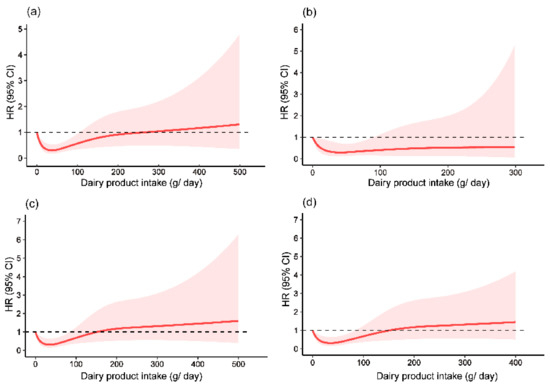Restricted cubic spine plots to evaluate relationships between dairy product intake and fracture among (a) overall participants; (b) men; (c) women; and (d) women aged ≥ 45 years. HR and 95% CI were adjusted for age, sex, education level, region of residence, individual annual income, smoking history, drinking history, physical activity, BMI, chronic disease history, and intakes of total energy and total calcium.
