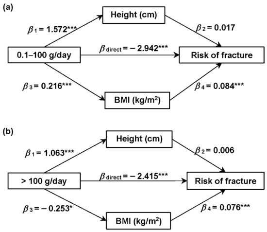 Mediation effect of height and BMI on the association of dairy product intake of (a) 0.1–100 g/day and (b) >100 g/day with the risk of fracture compared to no consumption of dairy products. Data are regression coefficients with adjustment for covariates (including age, sex, educational level, region of residence, individual annual income, smoking history, drinking history, chronic disease history, physical activity, and intakes of total energy and total calcium). * p < 0.05, *** p < 0.001.