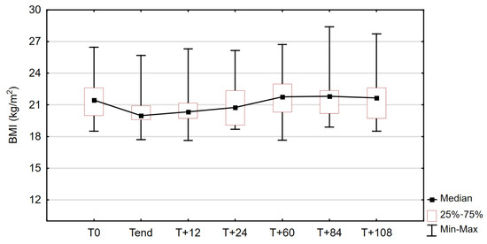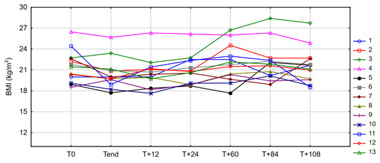 Compared with pretreatment values, no significant differences were observed at any of the time points studied. At the endpoint of observation (T+108), the median body weight was virtually the same as at baseline (54.7 vs. 55.0 kg), and in three patients, the body weight was identical to T0 values. The changes in BMI of each patient during the entire observation period, including baseline and post-treatment values, are shown in Figure 3.