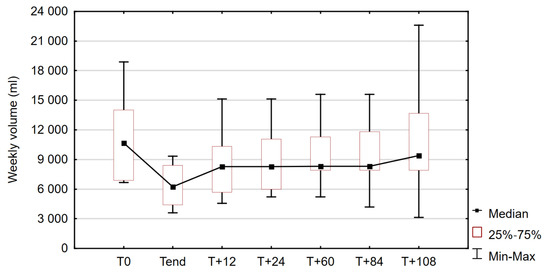 The values varied significantly between observation time points. Changes in median weekly PN volume in the study group during the observation period are shown in Figure 4.