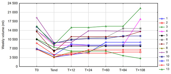 At 12 months (1 year) after discontinuation of TED (T+12), weekly volumes of parenteral nutrition were increased by 13.9–101.6% (median 44.4%) in 69.3% of patients (n = 9) compared with post-treatment values (Tend), corresponding to an increase of 1000–6720 mL (median: 1670) per 7 days. In three patients (23%), the PN volume remained unchanged and in one case a decrease of 1500 mL was observed. In one patient, the weekly volume at T+12 exceeded baseline (T0) by 1820 mL, but the mean values at T+12 were still statistically significantly lower in the study group than before administration of TED (p = 0.027).