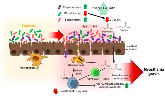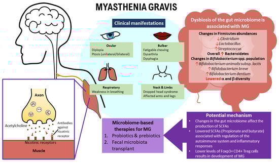 Gut microbiota dysbiosis could be linked with MG (Figure 2). The decrease in the Clostridium population could be associated with the imbalance of Foxp3+ CD4+ Treg cells, which are involved in regulating the amount of AChR Abs [116]. Besides this, the fermentation product of Clostridia is SCFAs, and it was found that MG is linked with lower levels of SCFAs, which help regulate the differentiation of Foxp3+CD4+ Treg cells. On the other hand, the higher level of Streptococcus in MG subjects may impact PPARγ, which affects transcriptional regulation. However, Bifidobacterium, which belongs to the phylum actinobacteria, has a large inter-individuality, indicating that MG is related to specific species of bacterium. Microbial diversity is correlated to MG severity, in which, as the QMG score increases, the α diversity index drops. A total of 30 metabolites were recognized to distinguish MG subjects from HCs, and all are involved in amino acid metabolism, microbial metabolism, and nucleotide metabolism. These changes in metabolite biomarkers correlate with microbial OTUs and the clinical symptomatology of MG, either due to the metabolites’ association with microbial metabolism or the disturbance in nucleotide metabolism involving changes in cytosine and methylmalonic acid or disturbance in xanthine, adenine, and oxalic acid. Moreover, a huge discovery is that the combination of microbial and metabolic biomarkers has been demonstrated to be a potential diagnostic biomarker providing 100% accuracy in discriminating MG subjects from HCs.