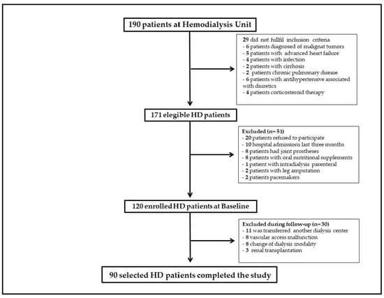 A prospective observational study was carried out at the Hospital Universitario La Princesa (Madrid, Spain) from March 2016 to January 2020. A sample of 190 HD patients were enrolled from one single dialysis unit (Figure 1). Patients aged over 65 years were eligible if they were on HD treatment and were found to be stable in the last three months prior to inclusion. Exclusion criteria were advanced heart failure, chronic pulmonary disease, cirrhosis, and certain comorbidities (infection or malign tumour); medications (NSAIDs, corticosteroid or diuretics); surgeries interfering with nutritional status; nutritional support (oral nutritional supplements, enteral or parenteral nutrition); patients with leg amputations, pacemakers or joint prostheses; and life expectancy less than 3 months. At baseline, 29 HD patients did not meet the inclusion criteria for participation in this study. Participants were censored on transplantation, change of dialysis modality and transfer to another centre. The final sample size was 90 HD patients (Figure 1). This study was conducted in accordance with the Helsinki Declaration and Good Clinical Practice Guidelines. Written informed consent was obtained from all participants before onset of this study. Ethical approval and permission to conduct this study were obtained from the local Ethic Committee (code number. 681).