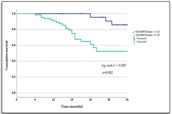 The predictive ability of the ECM/BCM ratio as an indicator of being wasted and fluid overload was previously described elsewhere by the authors []. Kaplan–Meier analysis showed that HD patients with the ECM/BCM ratio ≥ 1.20 had a higher probability of all-cause mortality (log-rank test x2 = 9.387; p = 0.002) as shown in Figure 2.