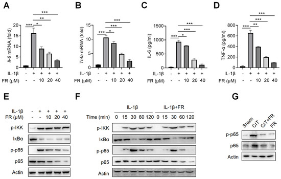 To investigate the mechanism of FR in inhibiting inflammation, we then treated the tenocytes with FR under the condition of inflammatory stimulation. Firstly, the CCK-8 result suggests that the concentrations of 0–40 μM of FR have no effect on the proliferation of tenocytes (Figure S1A), which indicates that this is the safe concentration range for the subsequent experiments. It is reported that IL-1β is highly expressed in tendinopathy, which is a key inflammatory mediator to mediate the inflammatory reaction and accelerate tendinopathy [39,41]. We then explored the effect of FR on the IL-1β-mediated inflammatory response of tenocytes and found that FR reduces the mRNA expression of Il-6 and Tnfa induced by IL-1β (Figure 3A,B). Meanwhile, FR also inhibited the protein expression of IL-6 and TNF-α proteins mediated by IL-1β (Figure 3C,D). These data indicated that FR effectively inhibits the IL-1β-mediated release of inflammatory factors in tenocytes. In addition, we also examined the effect of FR on the inflammatory responses mediated by other inflammatory factors. Both LPS- and TNF-α-mediated inflammation can be effectively alleviated by FR (Figure S1B–E). Therefore, FR can effectively inhibit the inflammatory response of tenocytes induced by various inflammatory mediators.