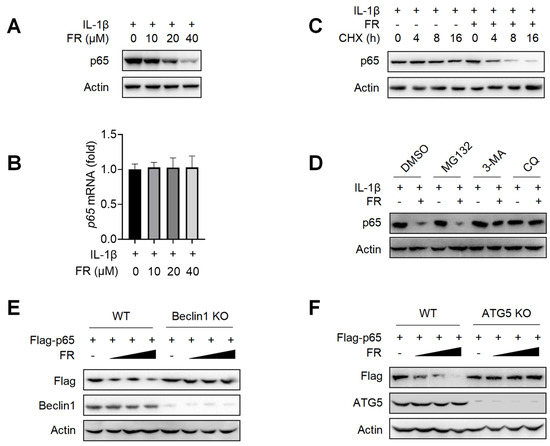 Since there are at least three protein degradation systems (the proteasome, lysosome, and autolysosome pathways) [42], we next determined for which pathway FR induces the degradation of p65. The degradation of p65 by FR was reversed when the autophagy inhibitor 3-MA and the lysosomal inhibitor CQ were used, but not by the proteasome inhibitor MG132 (Figure 4D). To further confirm that FR degrades p65 protein through the autophagy-dependent pathway, we used Beclin1 deficiency or ATG5 deficiency HEK293T cells for verification. In WT HEK293T cells, FR significantly promoted the degradation of exogenous p65 protein. However, when Beclin1 or ATG5 was knocked out in HEK293T, the degradation of p65 by FR disappeared (Figure 4E,F). These results demonstrated that FR promotes the degradation of p65 through an autophagy-lysosome pathway.