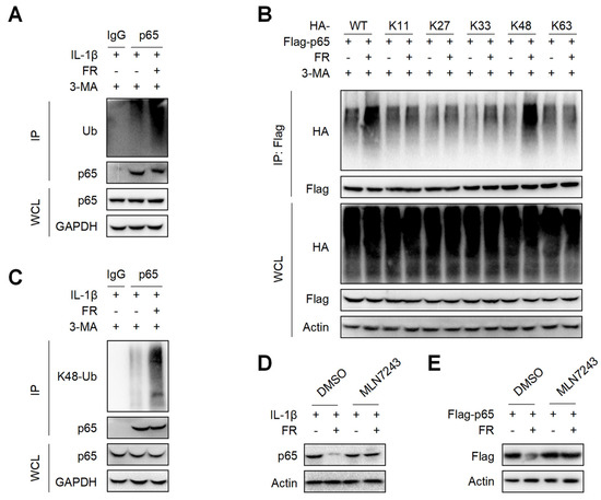 It is reported that p62 directs ubiquitinated proteins to autophagolysosomes for selective degradation mainly through its C-terminal ubiquitin-associated domain [42,43]. Next, we investigated whether FR could affect the ubiquitination of p65 and found that FR remarkably increased the poly-ubiquitination of endogenous p65 (Figure 6A). Subsequently, we found that FR specifically increased K48-linked (K48-only ubiquitin mutant) poly-ubiquitination of p65, but not the ubiquitination of p65 with other ubiquitin linkages in an overexpression system (Figure 6B). Likewise, FR also promoted the K48-linked ubiquitination of endogenous p65 (Figure 6C). In addition, the degradation of p65 by FR was reversed in the presence of ubiquitin inhibitor MLN7243 (Figure 6D,E). These data suggest that FR accelerates p62-mediated selective degradation by promoting the K48-linked ubiquitination of p65.
