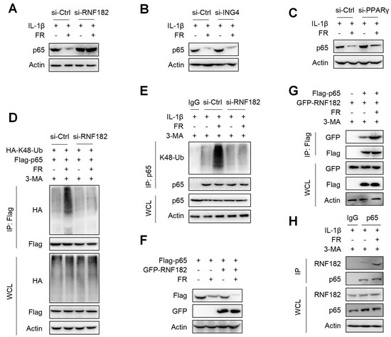 It is reported that E3 ubiquitinase is a key enzyme mediating protein ubiquitination [44]. Although FR promotes the ubiquitination of p65, it is not clear which E3 ubiquitin enzyme plays a key role in the FR-induced ubiquitination of p65. It is reported that RNF182, ING4, and PPARγ are E3 ubiquitination enzymes that mediate the K48-linked ubiquitination of p65 [45,46,47]. Next, we determined which E3 ubiquitin enzyme plays its role in the FR-mediated ubiquitination of p65. We silenced the expression of RNF182, ING4, and PPARγ in tenocytes by the siRNAs (Figure S2A–C) and found that silencing RNF182 reversed the degradation of p65 by FR (Figure 7A), whereas silencing ING4 and PPARγ did not reverse the degradation of p65 (Figure 7B,C), which indicates that FR mediates the degradation of p65 through the RNF182-dependent pathway. Next, we examined whether FR mediated the K48-linked ubiquitination of p65 through RNF182 and found that FR failed to promote the K48-linked ubiquitination of p65 when RNF182 was silenced in the overexpression system (Figure 7D). Meanwhile, similar results were obtained in the endogenous IP experiment (Figure 7E). In addition, in the case of overexpression of RNF182, FR could further promote the degradation of p65 (Figure 7F). These data suggest that FR mediates the K48-linked ubiquitination of p65 by recruiting RNF182, promoting autophagic degradation. Furthermore, we also found that FR effectively increased the interaction between RNF182 and p65 in the overexpression and endogenous systems (Figure 7G,H). Therefore, these data suggest that FR promotes the K48-linked ubiquitination of p65 by promoting the association of RNF182 and p65, thus accelerating the autophagic degradation of p65.