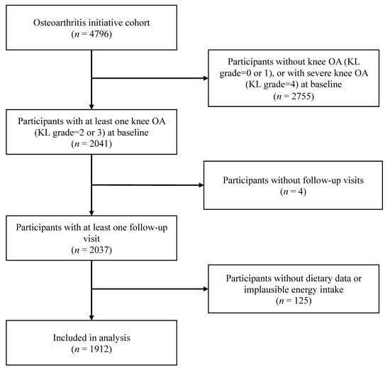 To assess the knee OA progression, we included participants with at least one knee with radiographic OA at baseline, which is defined by a Kellgren–Lawrence (KL) grade ≥ 2, on the basis of the central reading of a standardized fixed-flexion radiographic. The index knee from each participant was used, and if the participant had two eligible knees, the one with a KL grade = 3 was selected as the index knee; if both knees had the same KL grade, the knee with the higher Western Ontario and McMaster Universities Osteoarthritis Index (WOMAC) knee-pain score was selected as the index knee; if both knees had the same WOMAC pain score, we randomly selected one as the index knee by using a random number generator. Participants without radiographic OA (KL grade = 0 or 1 at baseline) were excluded, as were those with severe radiographic OA (KL grade = 4), as they were less likely to experience further radiographic progression. We also excluded participants with missing or implausible total daily calorie intakes (<800 or >4200 kcal for men; <500 or >3500 kcal for women) [19]. Finally, 1912 participants were included and were followed up at 12, 24, 36, 48, and 72 months.