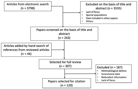 The search yielded 3798 references. Title, or title and abstract when the title raised uncertainty about the content of the paper were examined by five investigators (CB, AM-A, SS-B, AG-V, and AM-T). Disagreements between them were settled by consensus with the corresponding (AC) and the two other senior authors (FK and AN). The selection included a total of 263 papers, together with 44 articles obtained by hand-search of reference lists of the selected papers. Finally, 307 papers were reviewed in depth, and, from these, 120 papers were selected for citation. The flowchart of the literature search is represented in Figure 2.